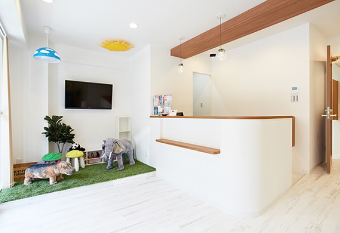 用賀駅から徒歩2分の立地にあるゆずる葉歯科では、子供たちが安心して過ごせるよう、人工芝を敷き詰めた広々としたキッズスペースを設けています。絵本や知育玩具も充実しており、子供たちが歯科医院の訪問を楽しみに感じられるような環境を提供しています。